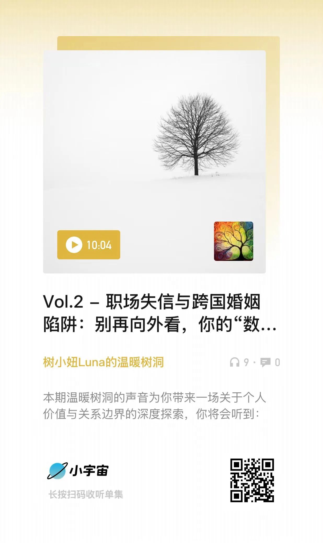 PS:如果有兴趣听听树洞群在聊啥,可以订阅小宇宙栏目**「树小妞Luna的温暖树洞」**,干货满满,有温度有深度的宝藏节目哦!